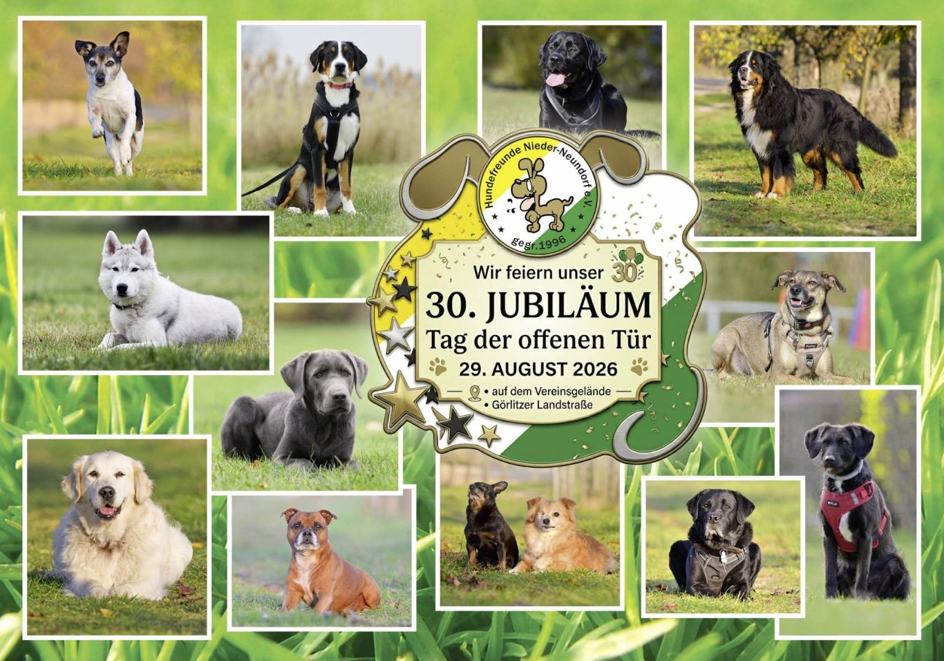 Am 29. August 2026 feiern wir das 30. Vereinsjubiläum des Hundevereins Hundefreunde Nieder-Neundorf e.V. Dieses besondere Ereignis steht ganz im Zeichen der Gemeinschaft und der Liebe zu unseren vierbeinigen Freunden. An diesem Tag laden wir alle Hundeliebhaber und Interessierten herzlich ein, mit uns zu feiern und mehr über unseren Verein zu erfahren.